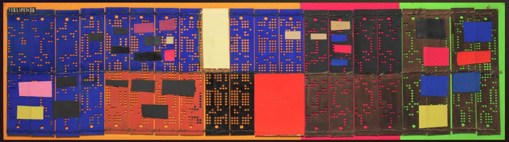 Last weekend, I went to the Tate Modern and saw the Electric Dreams exhibition. By far my favourite piece was Vera Spencer’s Artist versus Machine. She used Jacquard loom punch cards, added background colours and sewed them together. Funnily enough, the author of Thread Ripper, Amalie Smith appears again and writes on the Tate website about Spencer’s punch cards that “by reaching in and grabbing their core tissue, manipulating it, and giving it a new context as an aesthetic material, Spencer fought back against automation with the artist’s means, resisting the digital and insisting on an approach that was in touch with the material world around her.”