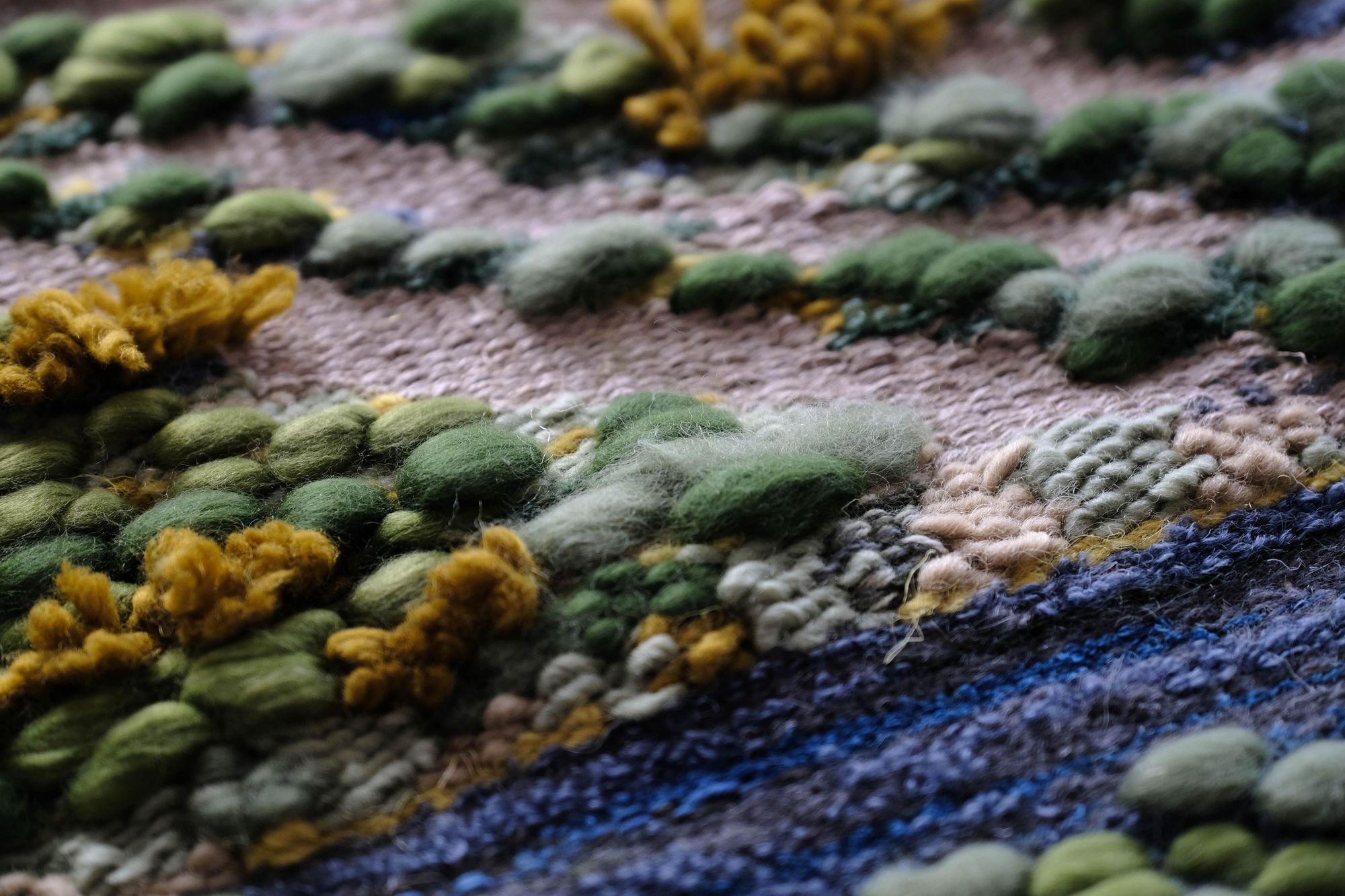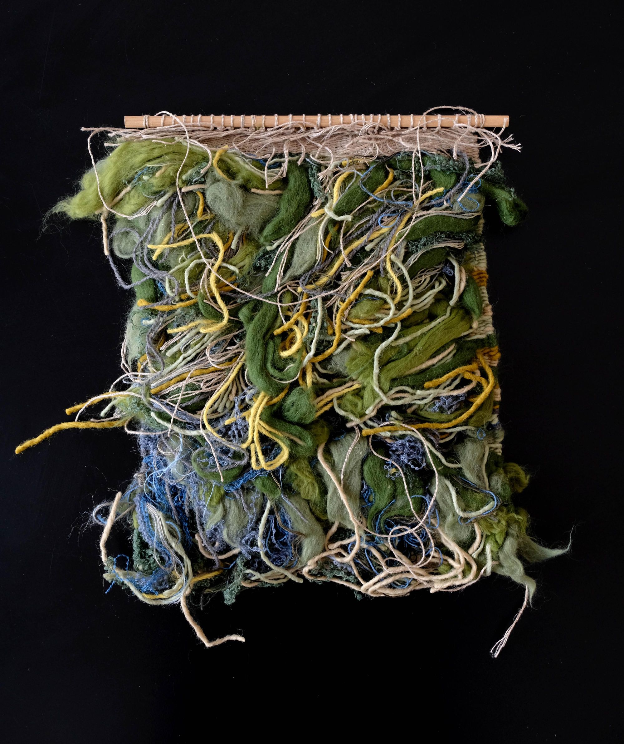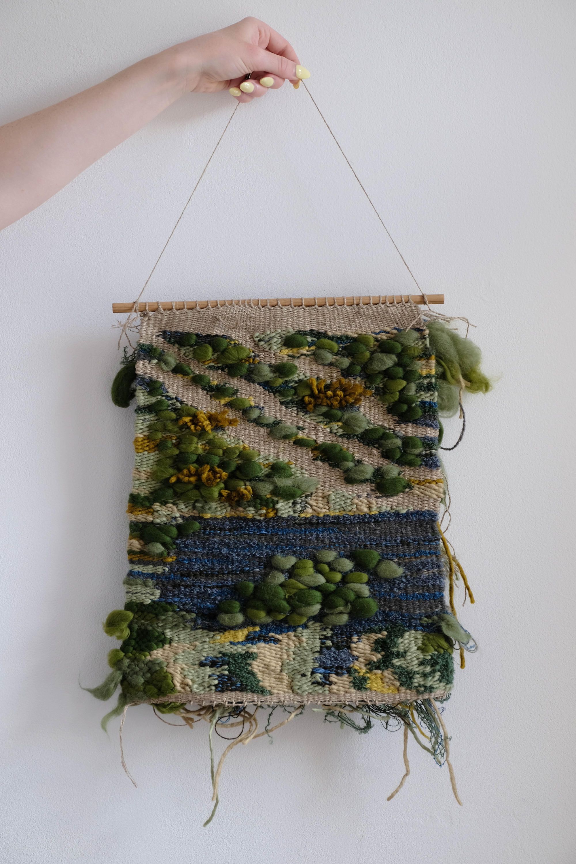 Handwoven on my backstrap loom. Linen warp with cotton slubs, linen, wool and other re-used materials.